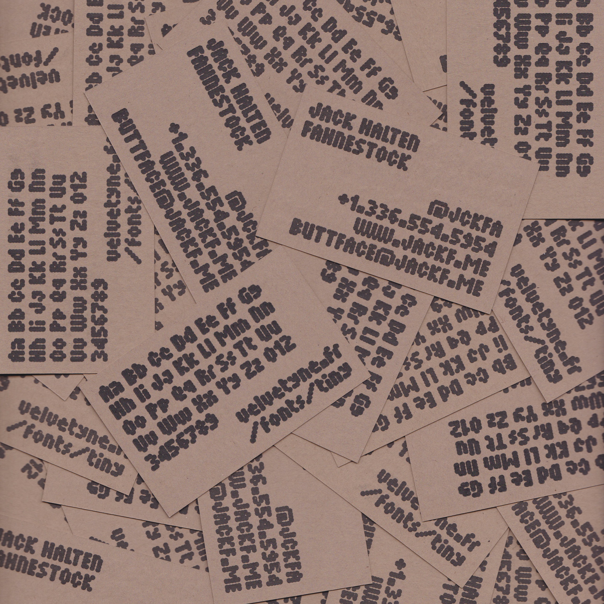 The TINY font family was originally created over the summer of 2018 as the visual identity for an experimental retail pop-up shop in Chinatown, New York City called “Today in New York”, or TINY for short. The shop was the result of an intern project at Verdes, a creative agency, between Jack Halten Fahnestock and Théïa Flynn, where they sold T-shirts and tote bags customized on the spot. TINY is based on the smallest type size (using only 5 of the 16 available print heads) of the HandJet EBS-250, the tool used in the shop for immediate printing on textiles. Its variable dot size comes from the HandJet’s adjustable ink output.